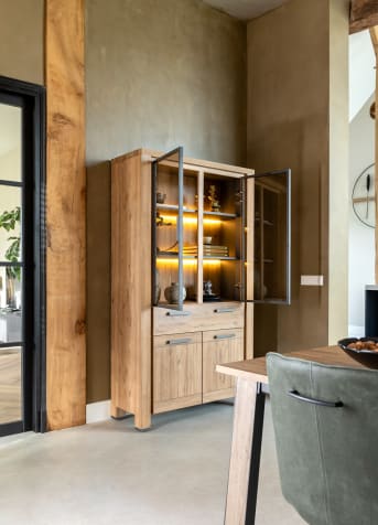 In dieser rustikalen, natürlichen Delmonte-Kollektion gibt es drei verschiedene Lowboards: eine kleine, mittlere und große Variante. Dies ist das kleinste Lowboard mit einer Breite von 140 cm und einer Höhe von 55 cm. Der Look dieser Kollektion ist eher klassisch, was auf die Lamellenstruktur der Schranktüren zurückzuführen ist. Die Kollektion wirkt massiv, besteht aber aus Primo Laminato (HPL) und ist daher besonders pflegeleicht. Das Möbelstück hat in der Mitte eine Schublade und jeweils eine Schranktür auf beiden Seite. Die Größe macht es zu einem idealen Möbelstück für kleinere (TV-)Räume und Sitzecken. Praktisch ist auch, dass in den Lowboards ein Kabelmanagement für alle elektronischen Geräte vorgesehen ist. Auffällig ist auch die integrierte LED-Stimmungsbeleuchtung mit Touch-Einbaudimmer, der der Kollektion einen modernen Touch gibt.