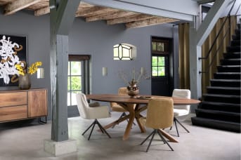 Dieser Armlehnstuhl Mia verfügt über ein zentrales Untergestell mit automatischer Rückdrehfunktion. Dank seiner großen Schale und der extra gepolsterten Rückenlehne ist er besonders bequem. Besonders schön am Design dieses Armlehnstuhls sind die horizontalen Ziernähte, die sich im Rücken und in der Sitzfläche fortsetzen. Der Stuhl ist mit dem Stoff Livigno, Chenille mit sichtbarem Flor, bezogen. Dies ist die Version in der Farbe Creme. Die Sitzhöhe der Stühle beträgt 50 cm, die Armlehnen sind 66 cm hoch Insgesamt sind sie 90 cm hoch.