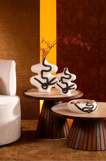 Die Curvy-Schale von COCOmaison ist ein moderner Hingucker, der in jedes Interieur passt. Diese stilvolle Schale aus Keramik hat eine matte, weiße Farbe und einen Durchmesser von 29 cm. Die schwarzen Streifen wurden von Hand aufgetragen und verleihen dem Design einen künstlerischen Touch. Die Curvy-Schale sieht perfekt auf einem schwarzen Tisch aus, macht aber auch auf einer Marmor-Arbeitsplatte in der Küche eine gute Figur. Ob als Obstschale oder dekoratives Objekt – die Schale bringt sofort eine feine Note in dein Zuhause. Kombiniere die Curvy-Schale mit einer der beiden passenden Vasen für ein harmonisches Gesamtbild.