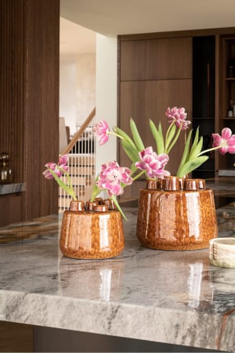 Du suchst nach etwas Besonderem für dein Interieur? Dann können wir dir die braune Vase SAFIA aus der Kollektion von COCOmaison empfehlen! SAFIA ist aus 100% Keramik und hat mehrere Öffnungen an der Oberseite. Schön mit ein paar dekorativen künstlichen Zweigen! Die Vase SAFIA wird in Portugal mit der Hand gefertigt und ist daher einzigartig in ihrer Verarbeitung. Die gesprenkelte Oberfläche erzeugt einen natürlichen Effekt. Sie ist 15 cm hoch und in zwei Größen und vier Farben erhältlich.